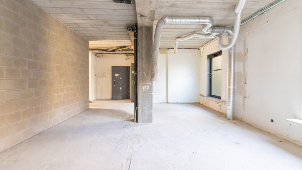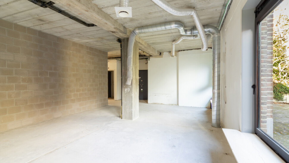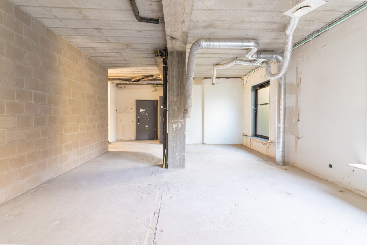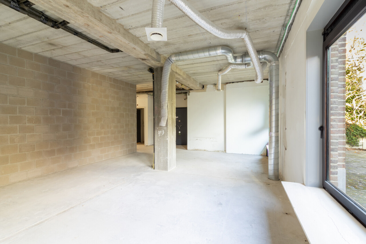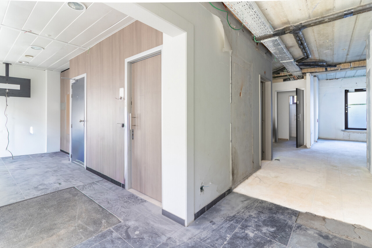 Naast de ruime centrale plaats, die uitkijkt op de parking, treft u ook de inkomhal en het sanitaire gedeelte.