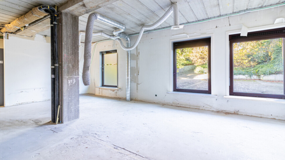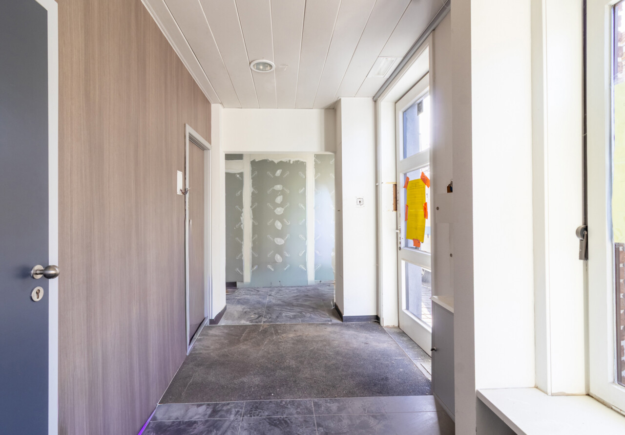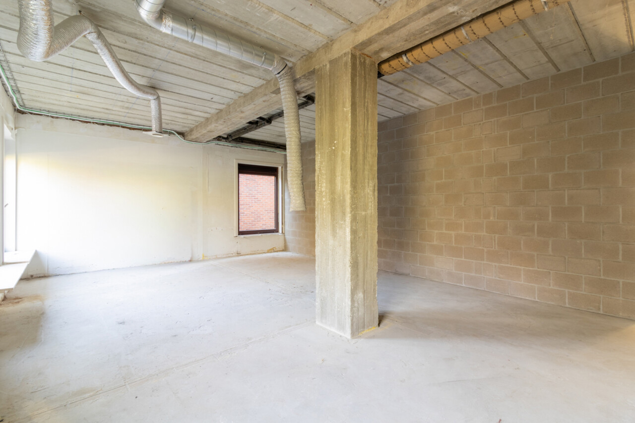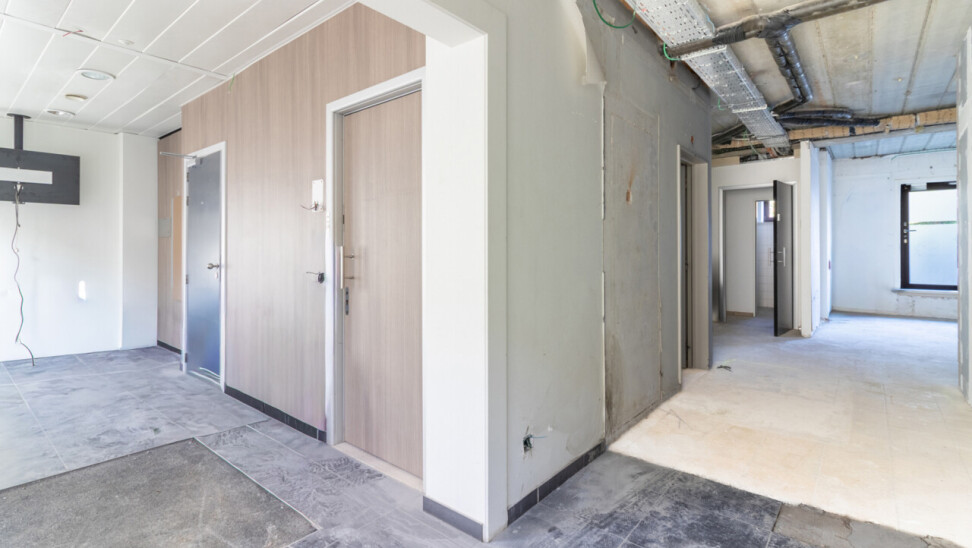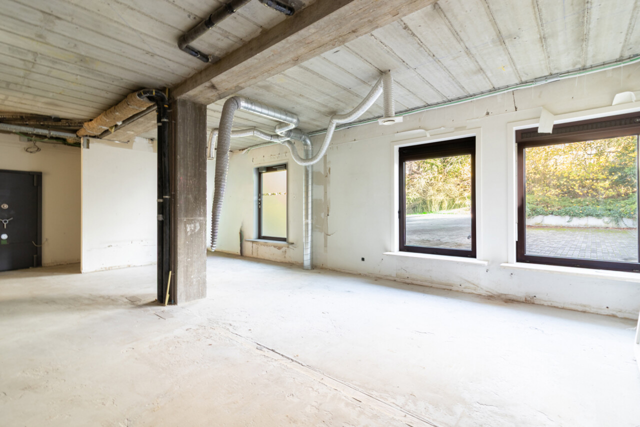 Naast de ruime centrale plaats, die uitkijkt op de parking, treft u ook de inkomhal en het sanitaire gedeelte.