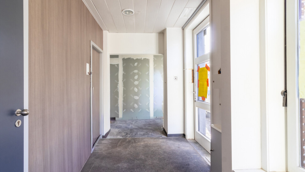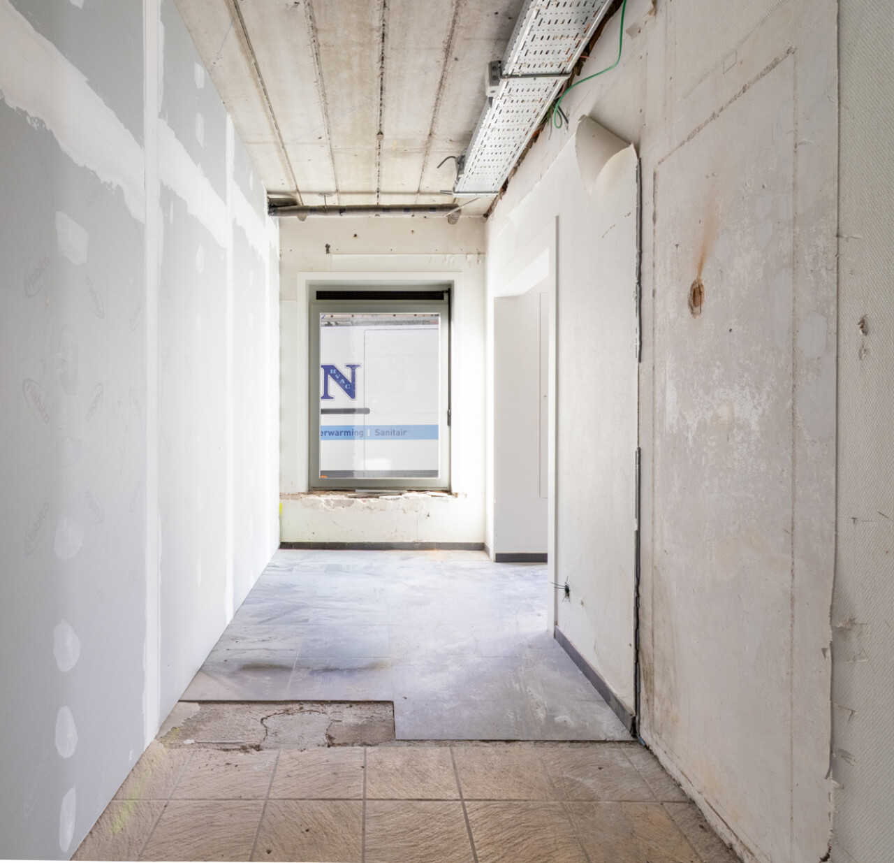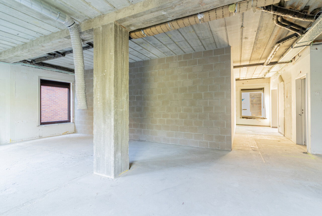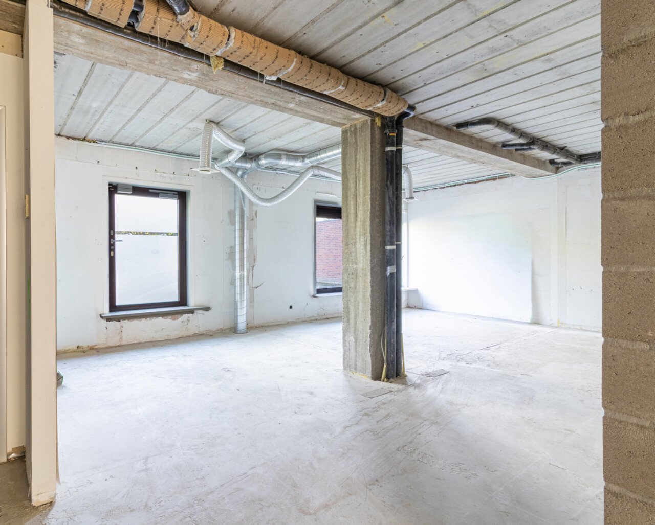 Naast de ruime centrale plaats, die uitkijkt op de parking, treft u ook de inkomhal en het sanitaire gedeelte.
