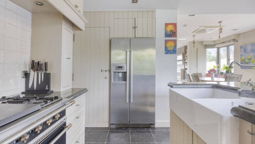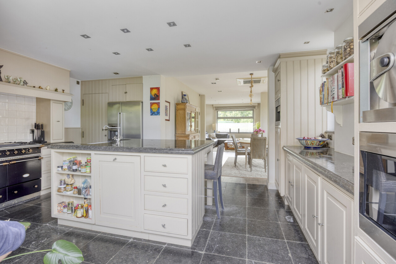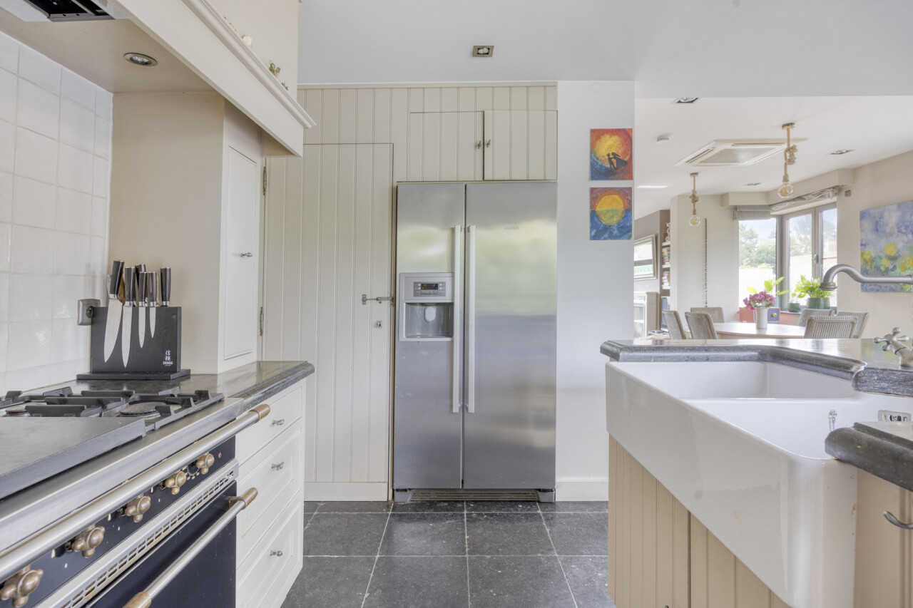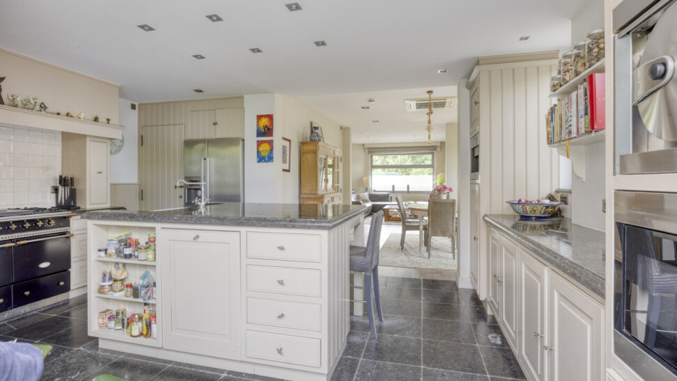 Via de inkomhal met afzonderlijk toilet bereikt u de gezellige leefruimte en open keuken met zicht op het zuiders terras. Naast de keuken bevindt zich een wasruimte / bijkeuken.