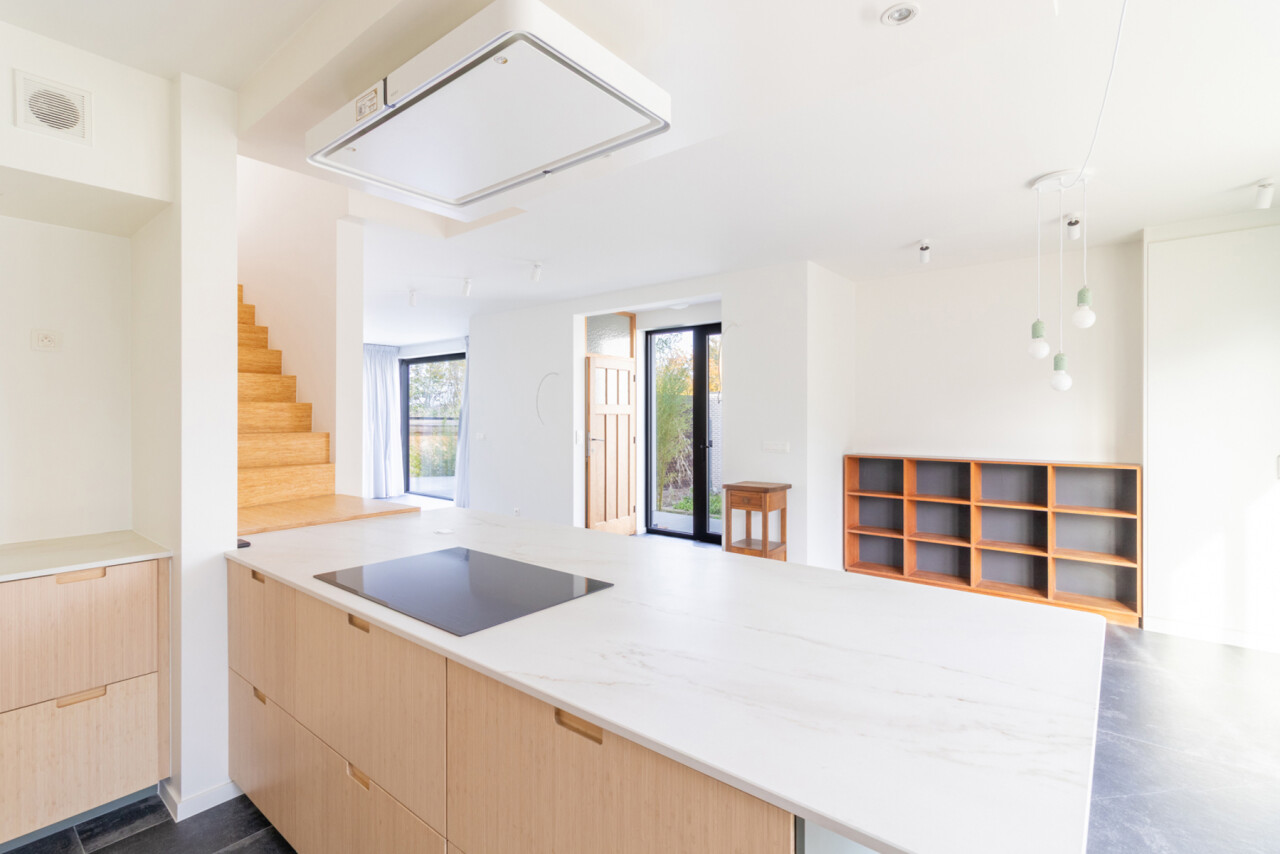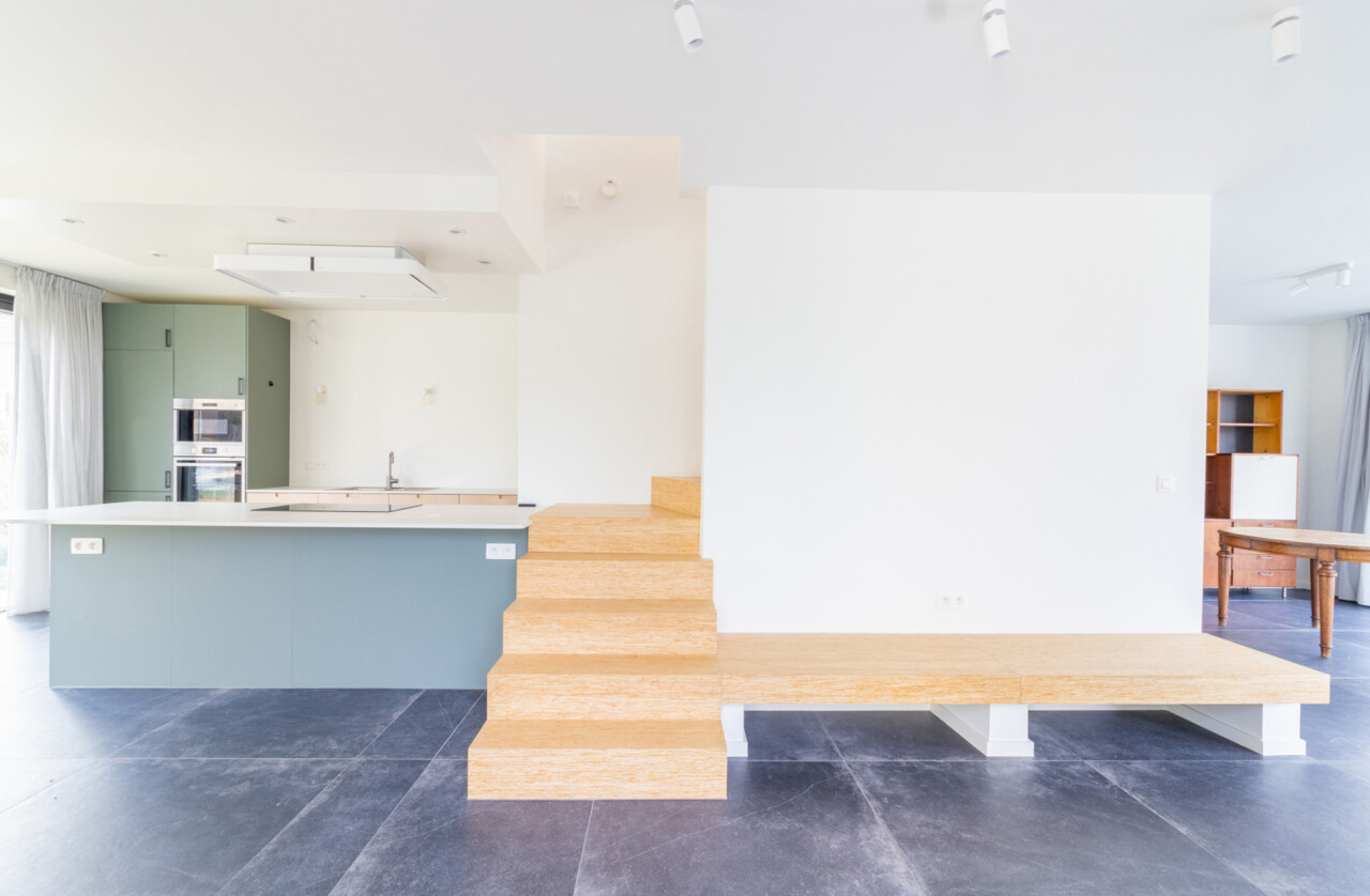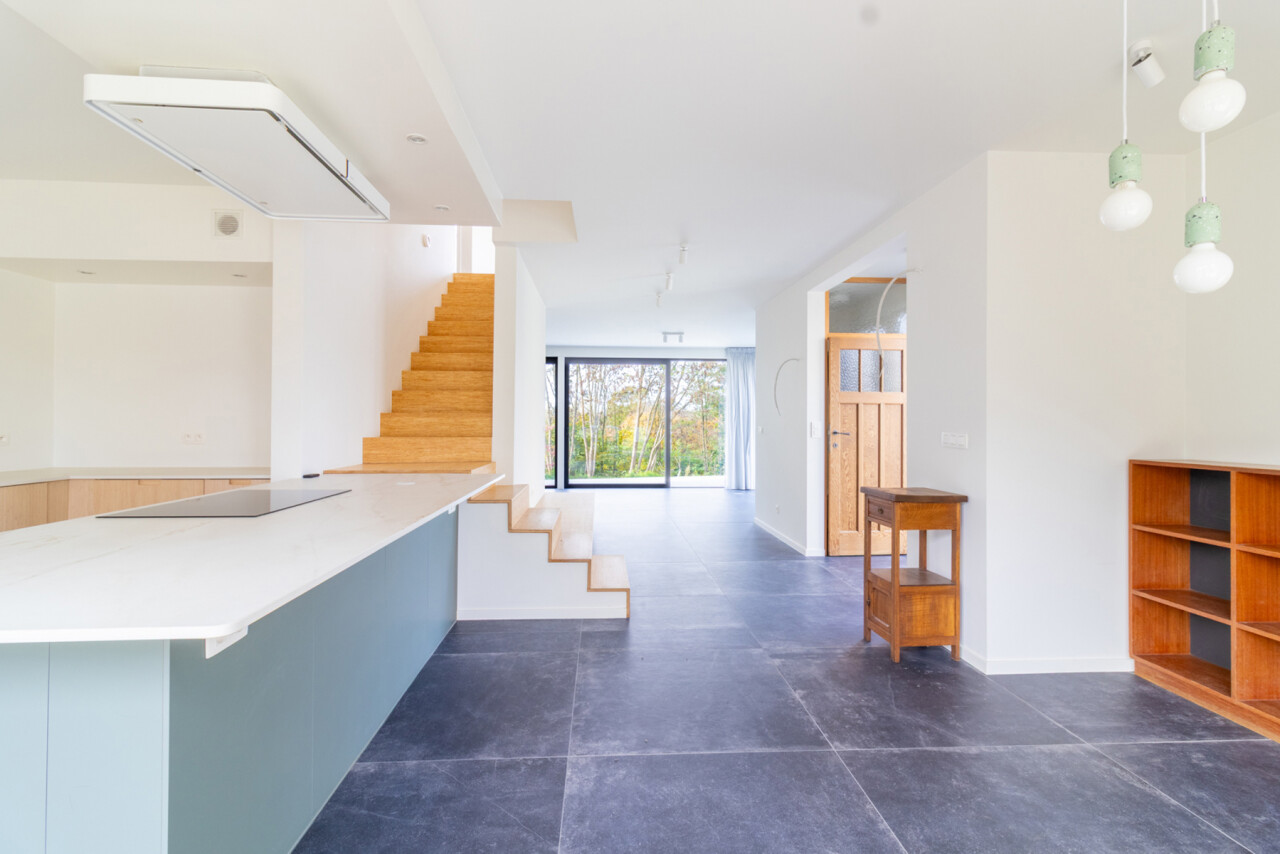 Op het gelijkvloers verwelkomt een open keuken met zicht op de leefruimte, je meteen. Aansluitend bevindt zich de gezellige woonkamer met uitzicht op het terras en de tuin — een ideale plek om te ontspannen of gasten te ontvangen. Een apart toilet aan de inkom vervolledigt deze verdieping.