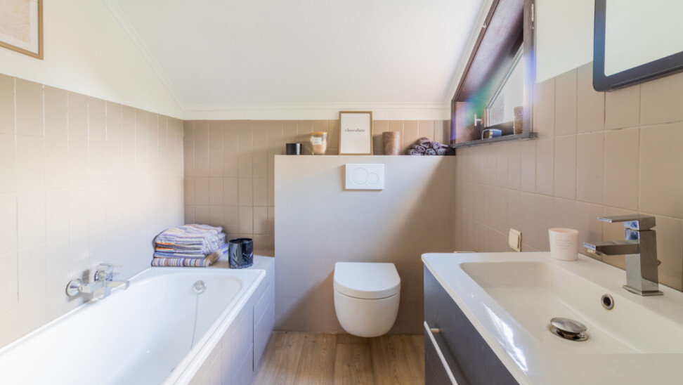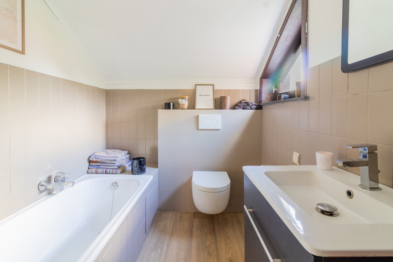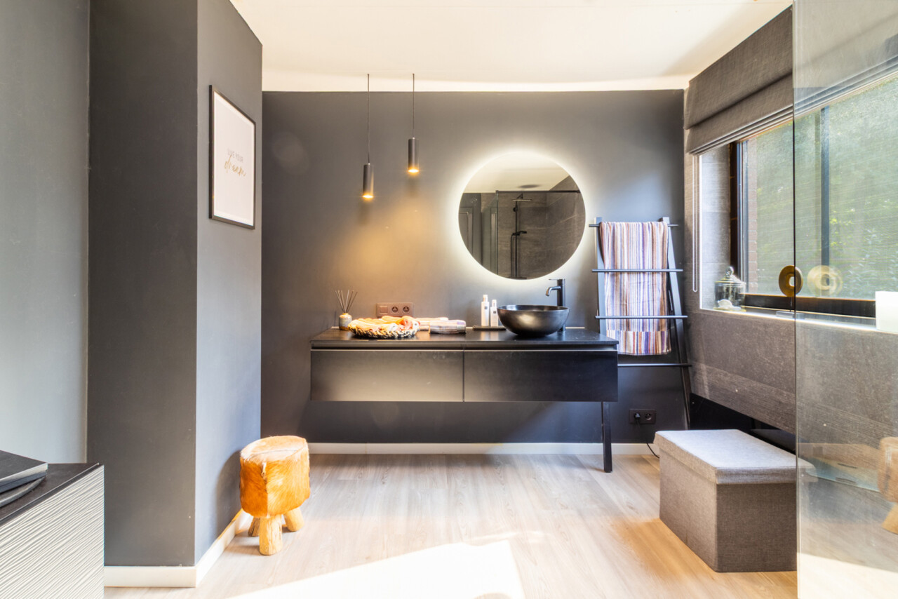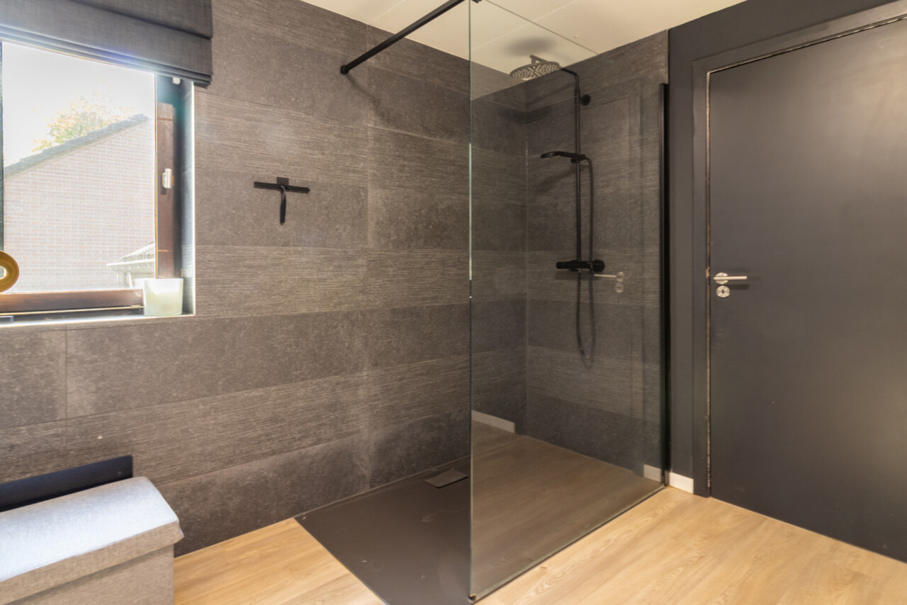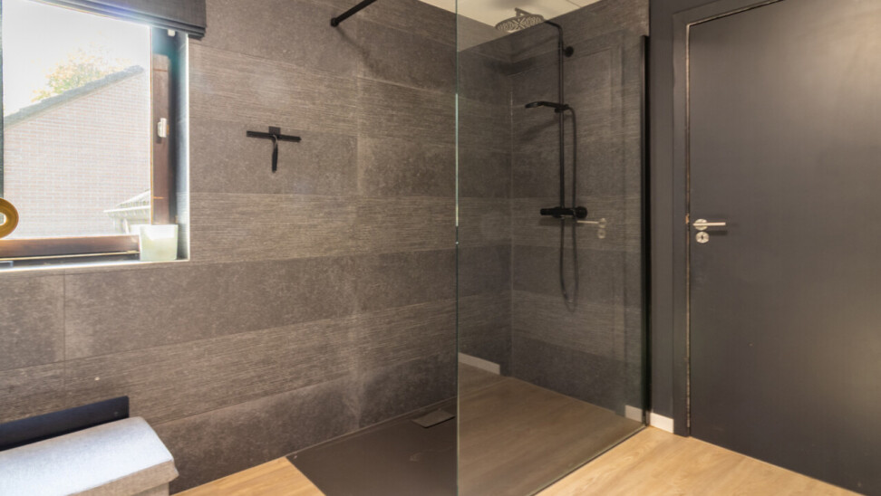 De volledig vernieuwde badkamer straalt luxe uit met een moderne inloopdouche — het voelt alsof je in een prachtig hotel logeert.