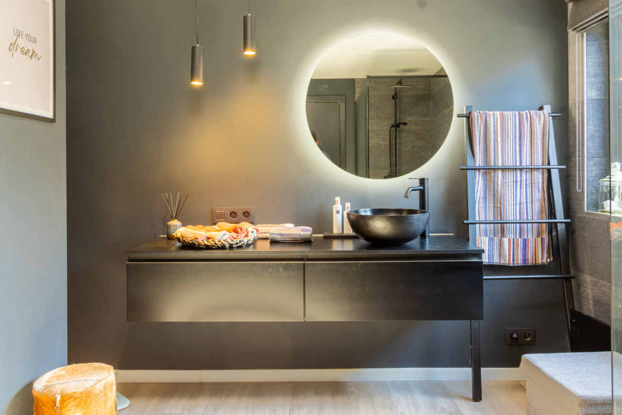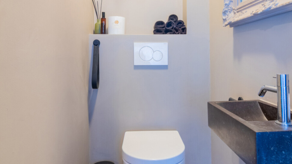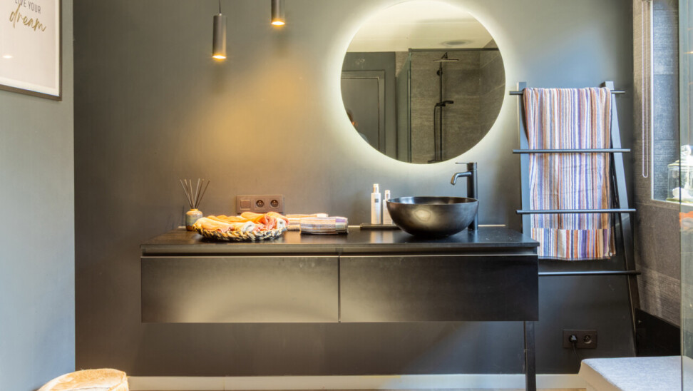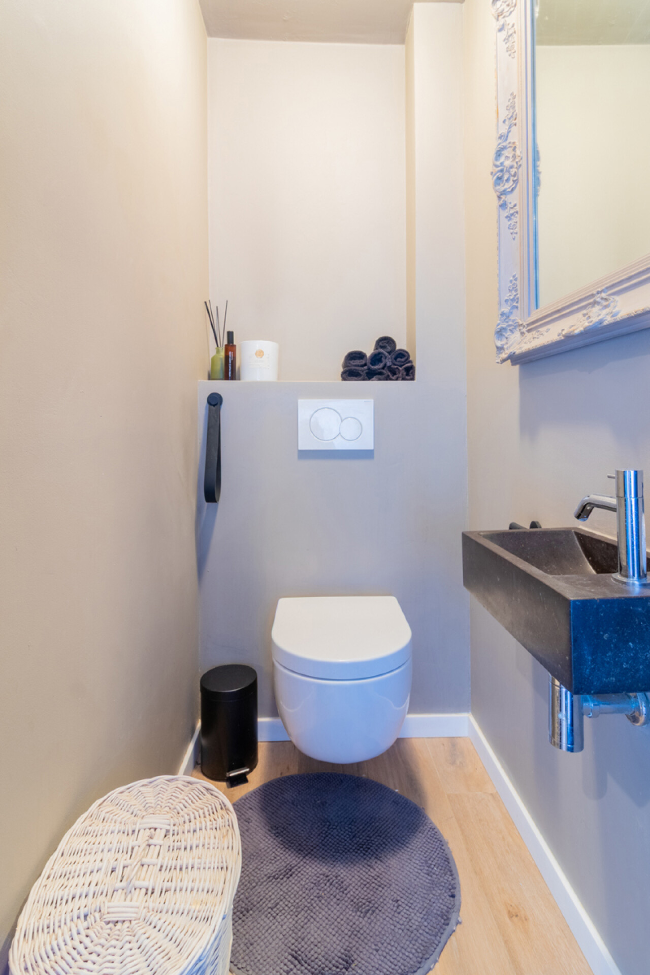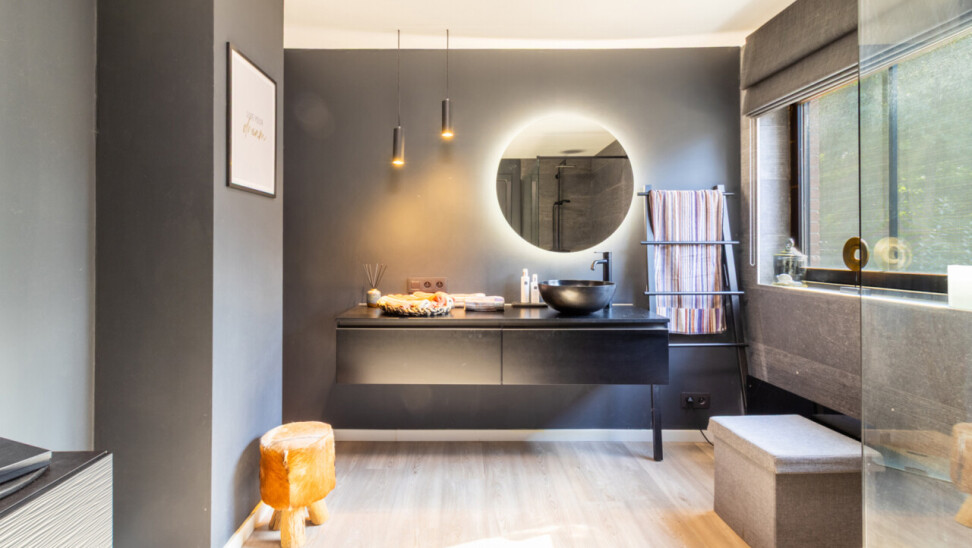 De volledig vernieuwde badkamer straalt luxe uit met een moderne inloopdouche — het voelt alsof je in een prachtig hotel logeert.