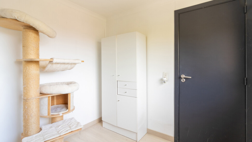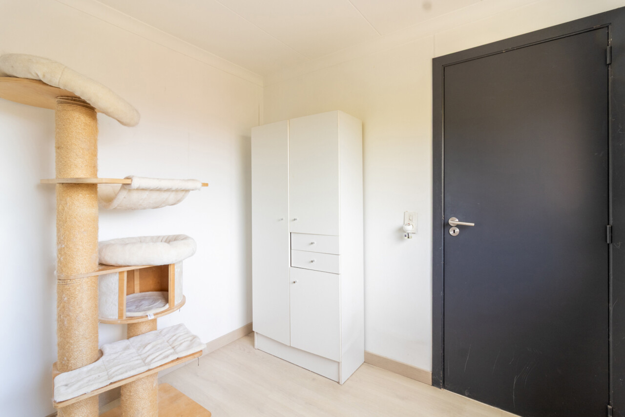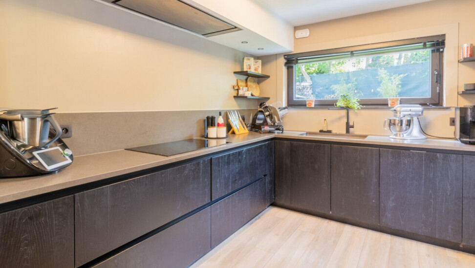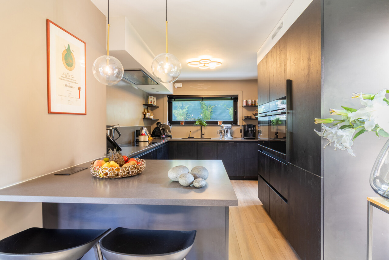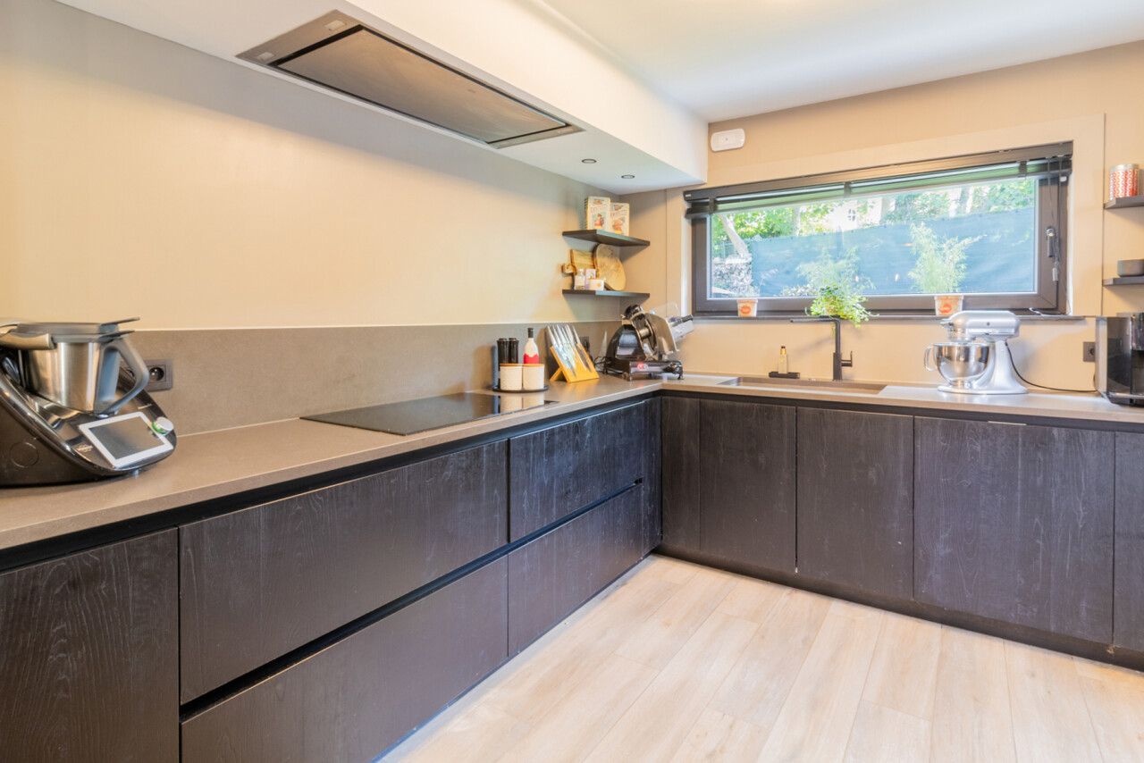 Het gelijkvloers verwelkomt je met een lichte, open leefruimte met zicht op de tuin. De volledig uitgeruste keuken beschikt over een oven, microgolfoven, stoomoven, vaatwasser en inductiekookplaat — ideaal voor wie graag kookt en gezellig samenkomt.