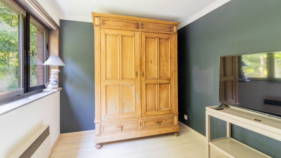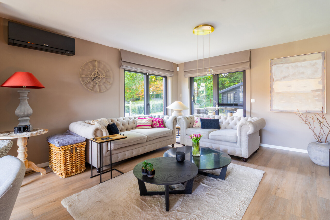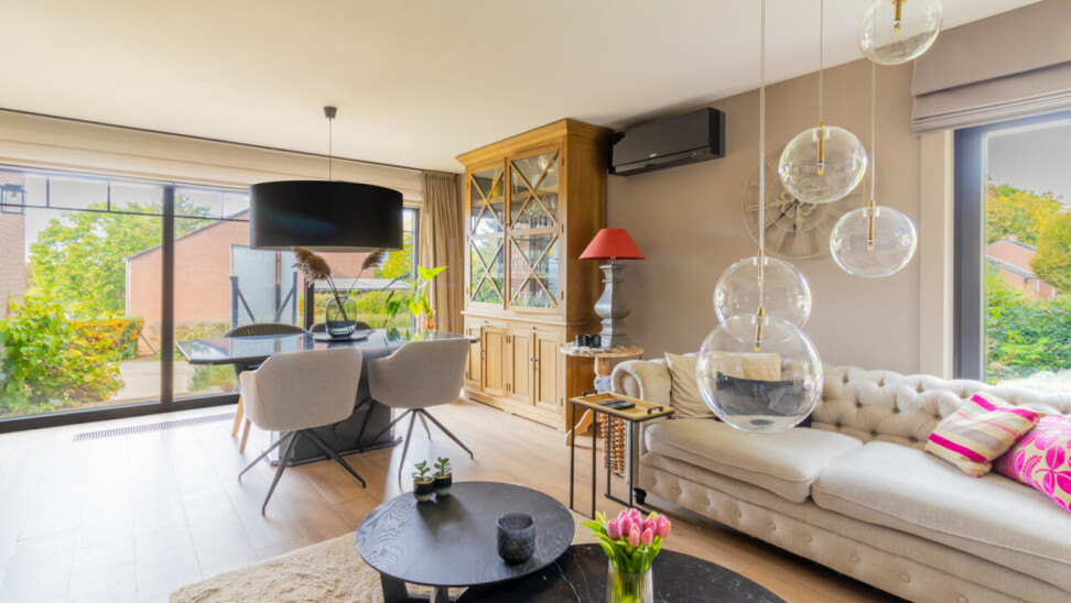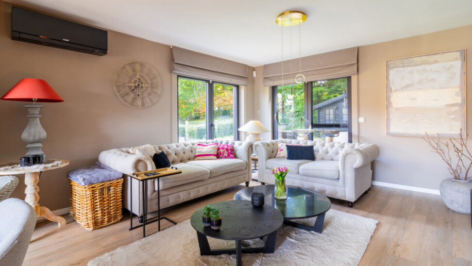 In de living zorgen een warmtepomp/airco-unit en een pelletkachel voor een aangename temperatuur, het hele jaar door.