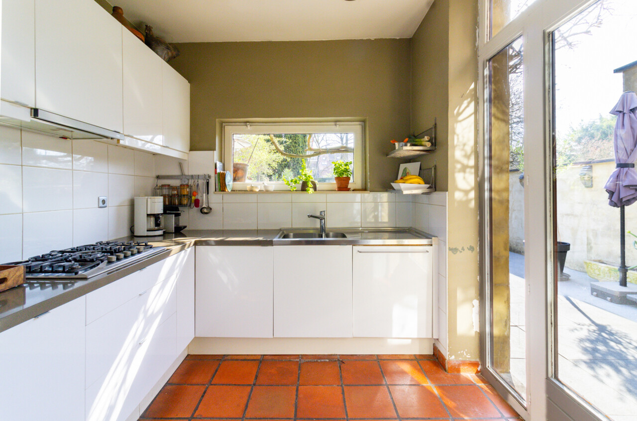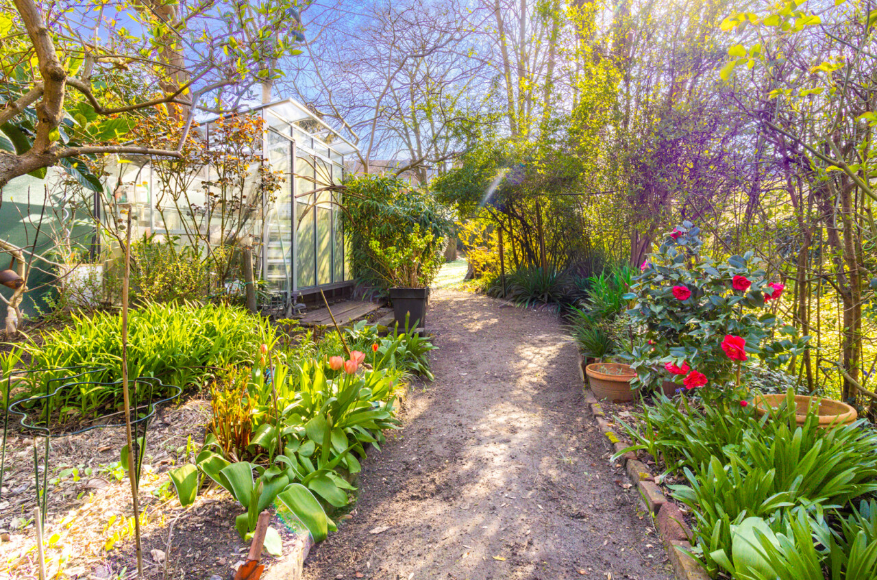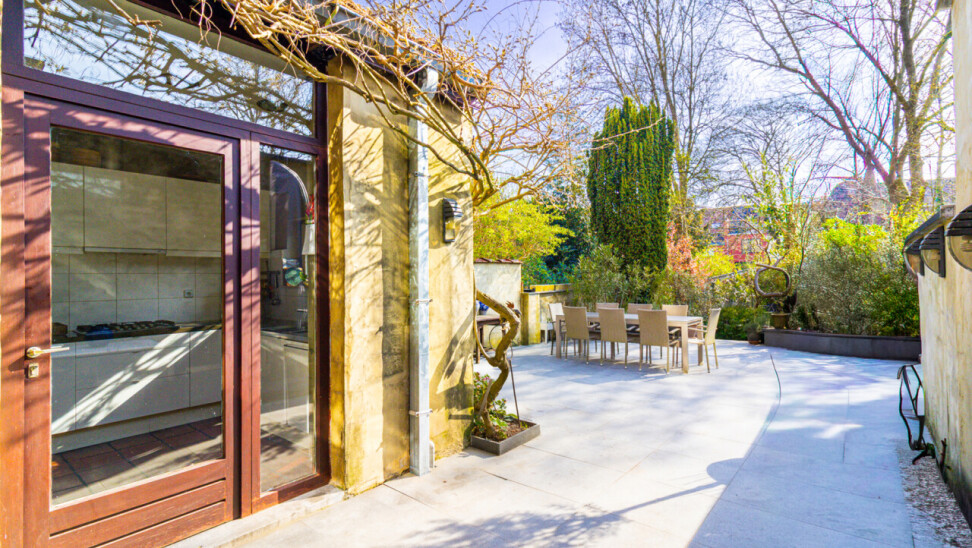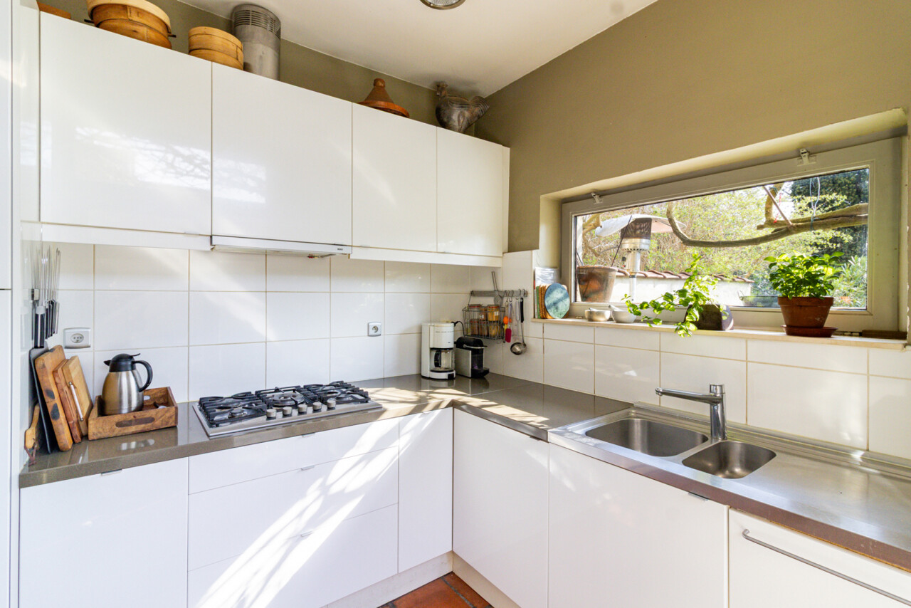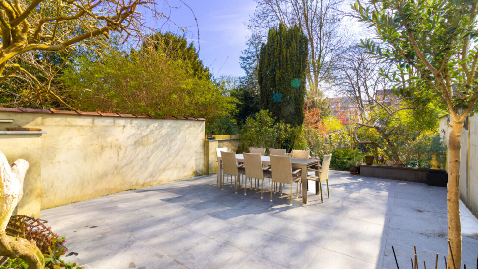 De zuidgerichte tuin, in het verlengde van het groot terras, is een verborgen parel waar de serre en de planten u een warm, zuiders gevoel schenken. Voor spelende kinderen is er een grasveld voorzien.