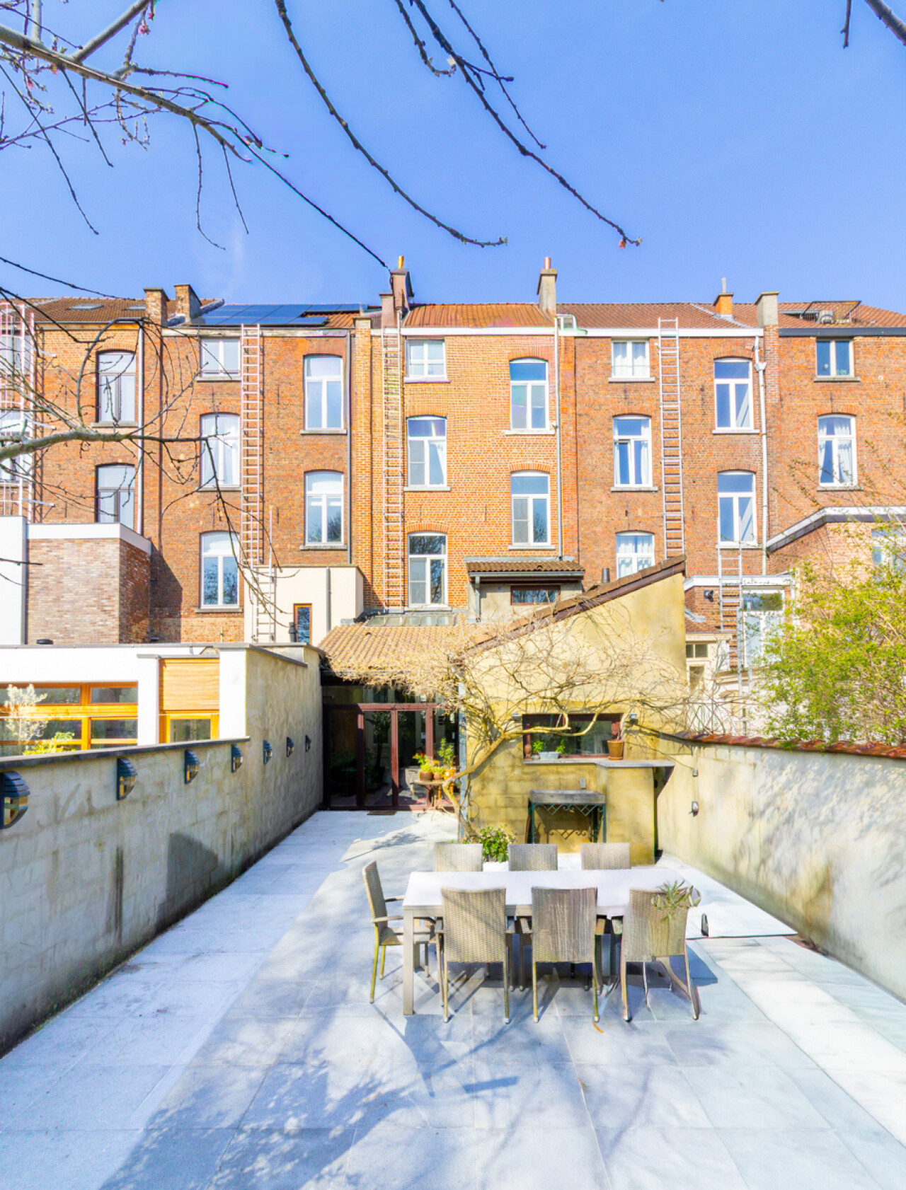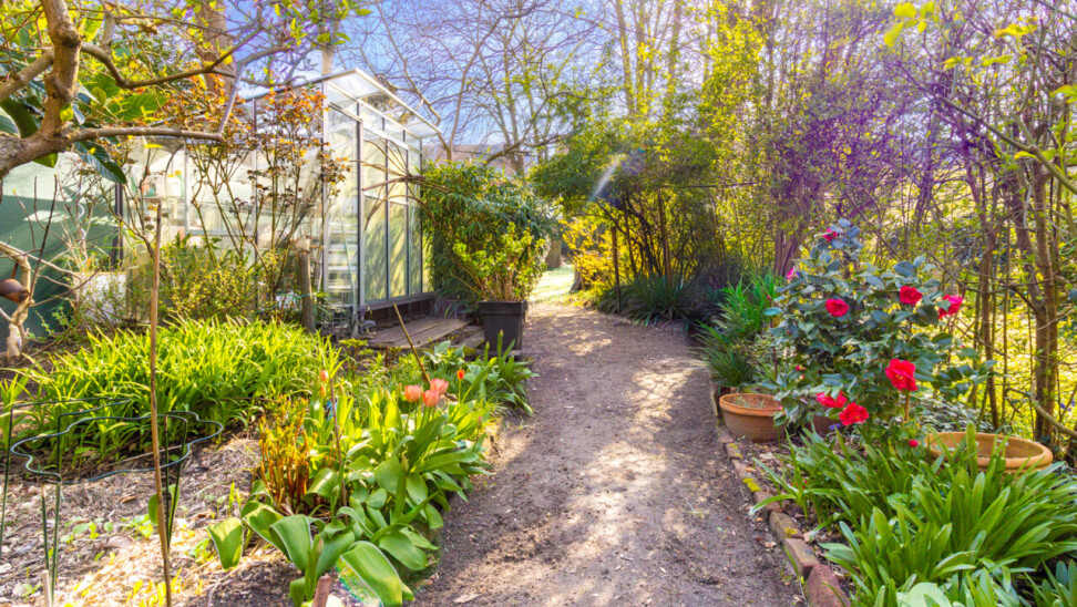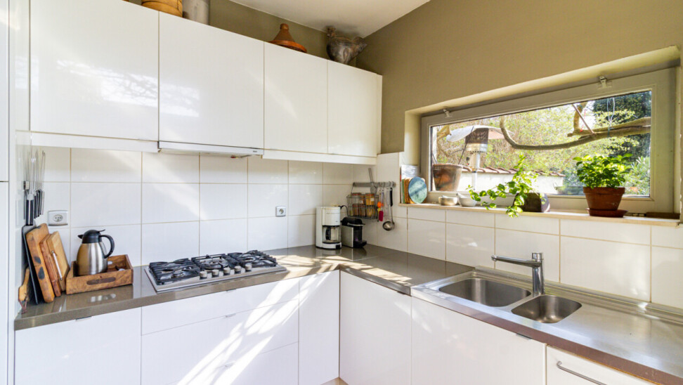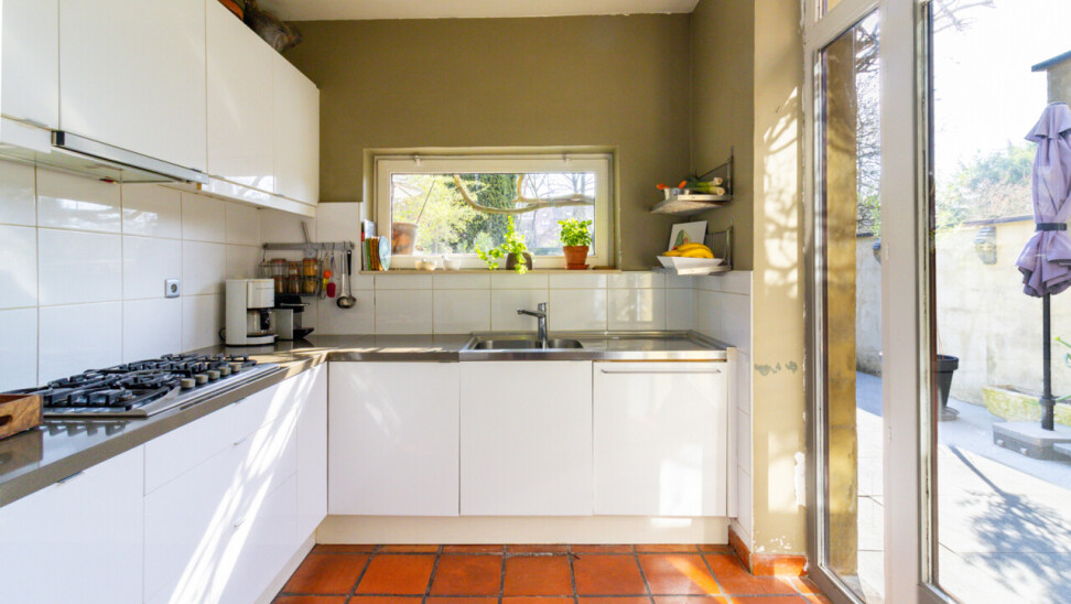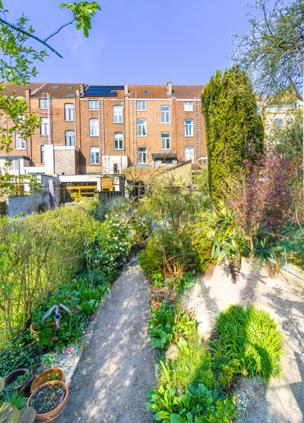 De zuidgerichte tuin, in het verlengde van het groot terras, is een verborgen parel waar de serre en de planten u een warm, zuiders gevoel schenken. Voor spelende kinderen is er een grasveld voorzien.