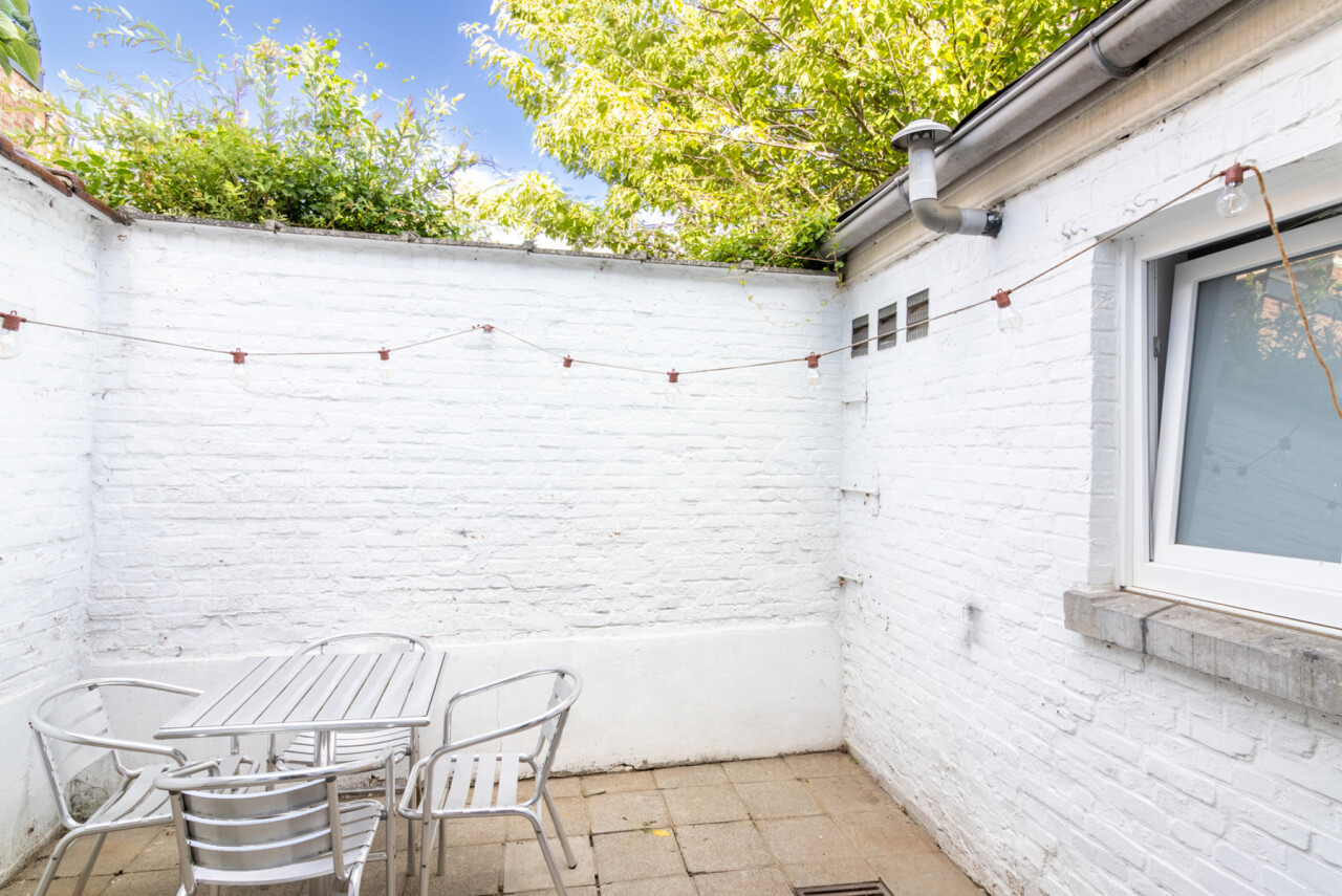 Op het gelijkvloers treft u een eerste ruime kamer, een inkomhal, een douche, een toilet, een leefruimte en een ingerichte keuken. De keuken geeft ook toegang tot een aangenaam, zonnig terras.
